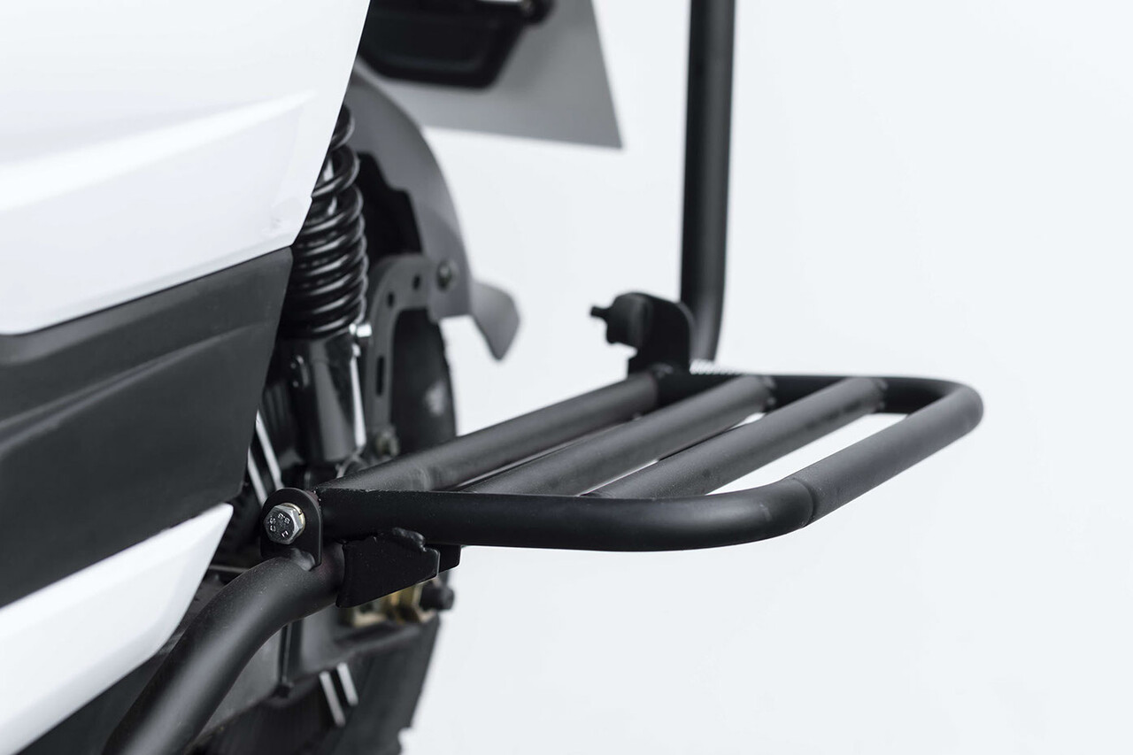 The scooter is available with a wide range of cargo boxes, racks and baskets.